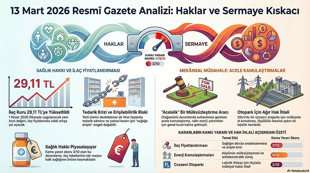 Bugünkü yayım, sermaye birikim süreçlerinin mekânsal tezahürleri (acele kamulaştırmalar) ve sağlık hakkının döviz kuru üzerinden piyasalaştırılması (ilaç fiyatlandırması) ekseninde oldukça kritik kararlar içeriyor.Bugün yayımlanan kararlar, 2026 yılı ekonomi-politik ikliminin iki temel sütununu ele veriyor: Maliyet artışlarının halka yansıtılması ve mekânsal müdahalelerin hızlanması.