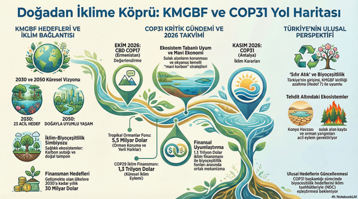 Bu metin, Kunming-Montreal Küresel Biyoçeşitlilik Çerçevesi ile COP31 iklim zirvesi arasındaki stratejik entegrasyonu ve 2026 yılına dair öngörüleri analiz etmektedir. Doğa kaybını durdurma hedefleri ile iklim politikalarının eşgüdümlü yürütülmesinin önemi vurgulanırken, ekosistem tabanlı uyum ve mavi ekonomi gibi kritik başlıklar öne çıkarılmaktadır. Kaynaklar, Türkiye’nin ev sahipliği yapacağı COP31 sürecinde biyoçeşitlilik finansmanının ve raporlama standartlarının nasıl bir rol oynayacağını detaylandırmaktadır. Özellikle Ekim 2026’daki CBD COP17 sonuçlarının iklim müzakerelerini nasıl şekillendireceği üzerine farklı senaryolar sunulmaktadır. Ayrıca, Türkiye’nin Sıfır Atık hamlesi gibi ulusal girişimlerinin küresel biyoçeşitlilik hedefleriyle olan potansiyel bağları değerlendirilmektedir. Sonuç olarak analiz, doğa ve iklim krizlerinin çözümünde bütüncül bir yaklaşımın gerekliliğine dikkat çekmektedir.